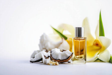 Elegant coconut perfume bottle surrounded by coconut shells and tropical flowers, evoking a sense of freshness and tranquility