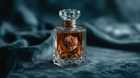 Elegant perfume bottle with rose on a velvet background.