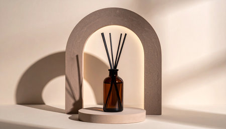 An amber glass reed diffuser with black sticks is displayed on a pedestal inside a beige arched niche, illuminated by warm light.