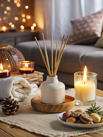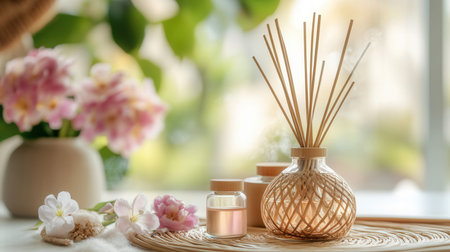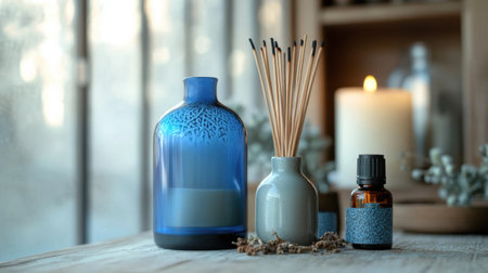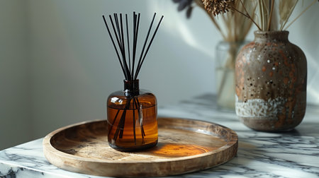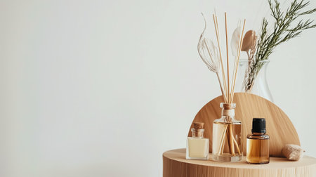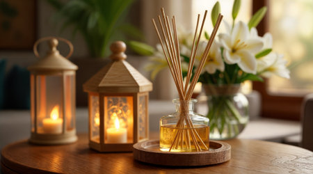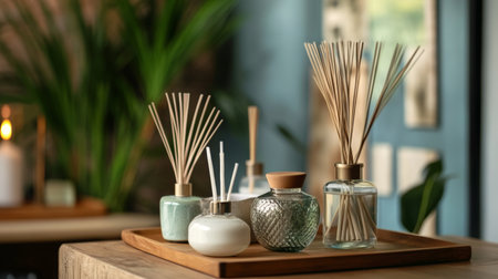A cozy and stylish setup featuring aromatic reed diffusers, wooden decor, and a relaxing ambiance.