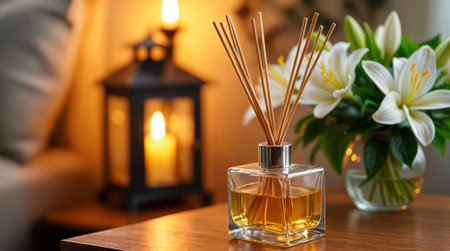 A fragrant reed diffuser with a glowing candle and fresh white lilies on a wooden table, creating a warm and cozy ambiance.