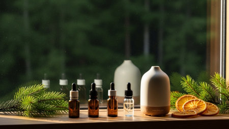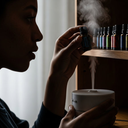 A display of essential oils and a diffuser on a bedside table highlighting the use of aromatherapy to promote relaxation and better sleep quality