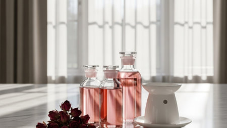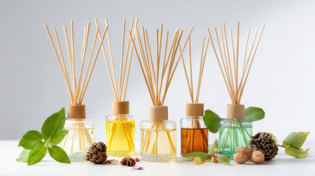 Elegant arrangement of essential oil diffusers with reeds and glass bottles on a minimalist surface