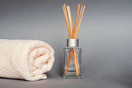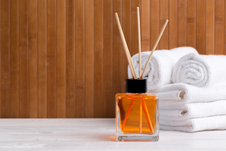 Reed diffuser with cosmetics for spa treatment on table