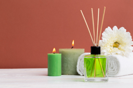 Beautiful spa composition with reed diffuser and candles on white table