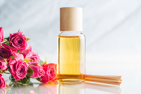 Clear bottle of yellow oil or perfume with wooden sticks and delicate pink roses on white surface. SPA salon and procedures concept. Copy space