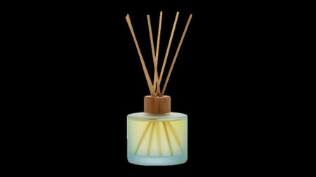 Reed Diffuser in a glass bottle The background is a light mint green with orange bokeh