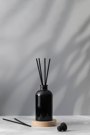 Two Black Reed Diffuser Bottles on a White Surface With Grey Background