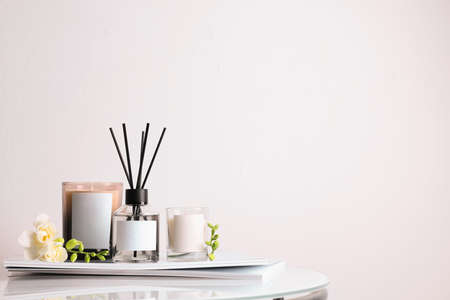 Composition with aromatic reed air freshener on white table, space for text