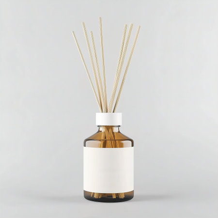 A beautifully designed bottle of reed diffuser containing sticks. Diffuser white blank label mockup
