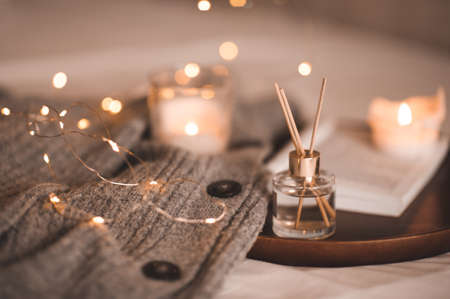 Liquid home fragrance in glass bottle with sticks, open paper book, burning scented candles and knit wool textile in bed close up. Winter holiday season. Cozy atmosphere. Aromatherapy.