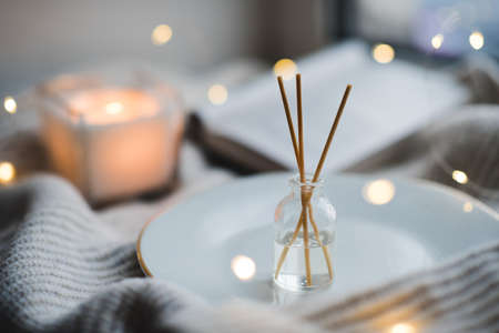 Home liquid perfume in glass bottle and wooden sticks with burning candle and open paper book on knit fabric cloth close up. Cozy warm atmosphere. Winter season.