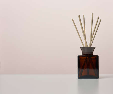 Brown glass bottle and wooden sticks, home fragrance
