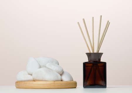 Beautiful spa composition with reed diffuser and stones on table