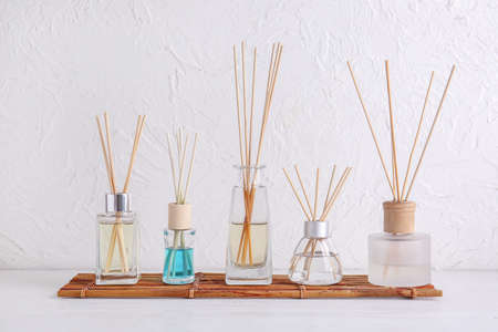 Different reed diffusers on table in room
