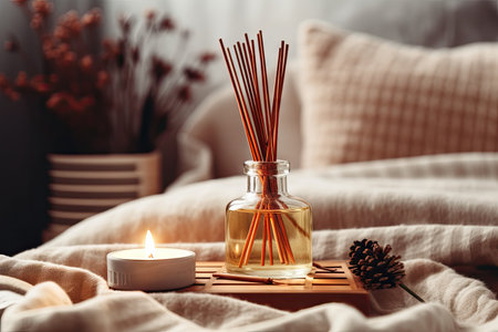 Home liquid scented fragrance in glass bottle with bamboo sticks on plate with burning candle in bedroom close up. Cozy atmosphere.