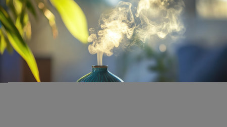 Soft blue and amber mist gracefully rises from a ceramic diffuser, creating a calming atmosphere in a serene indoor setting. The warm light enhances the peaceful mood.