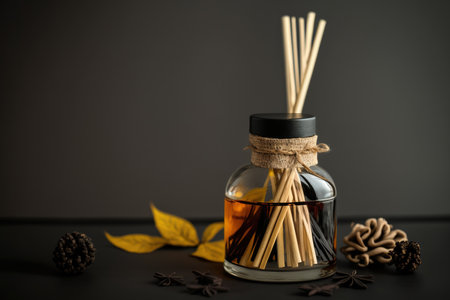 Simple aroma reed diffuser, home fragrance bottle with rattan sticks, and coffee aroma on dark surface with copy space