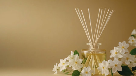 A beautifully crafted diffuser filled with scented oil stands among delicate white flowers. The soft golden backdrop creates a tranquil atmosphere, inviting relaxation and calmness.