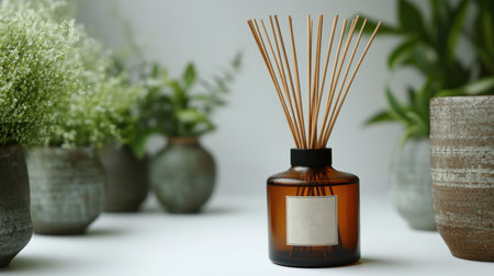 A beautifully crafted bottle of reed diffuser complete with sticks inside. Diffuser white blank label mockup