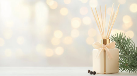 A decorative home fragrance diffuser features reed sticks elegantly arranged. A sprig of pine rests beside it, creating a warm, inviting atmosphere perfect for relaxation.