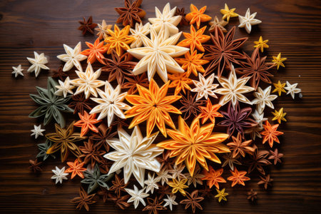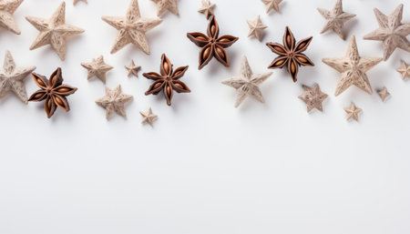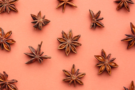 Decorative top view of star anise arrangement. Minimalistic spice photo ideal for design, packaging, or wellness visuals.