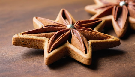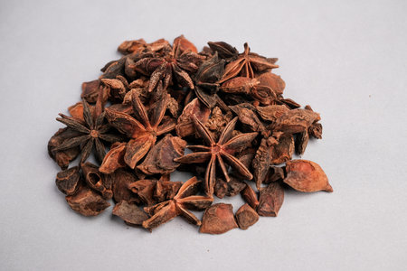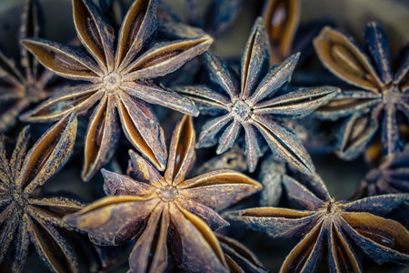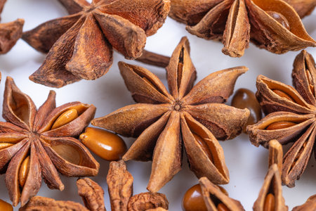 Close view of aromatic star anise, Highresolution image showing star anise seeds and pods, Closeup shot highlighting intricate surface and fragrant qualities of star anise