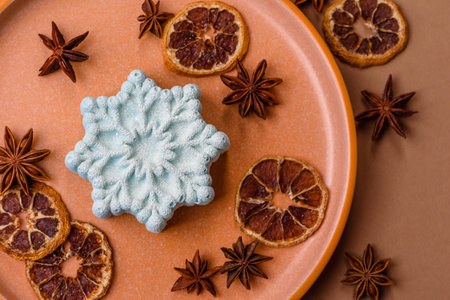 Christmas mochi, mooncake, or cheesecake shaped like a snowflake, an Asian dessert with a fruit filling.