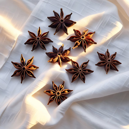 A collection of seven star anise pods is scattered across a white, textured fabric. The fabric is softly draped, catching warm sunlight that creates a golden glow and gentle shadows. Each star anise pod is a deep brown, showcasing its distinct eight-pointed shape and the small seeds nestled within. The arrangement is natural and organic, highlighting the beauty of the spice.