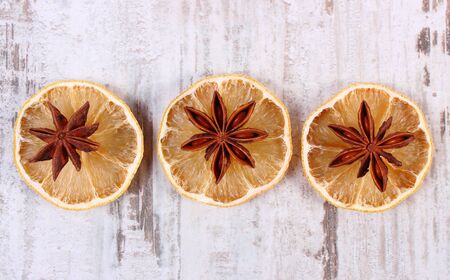 Slices of fresh dried lemon and star anise lying on old rustic wooden background