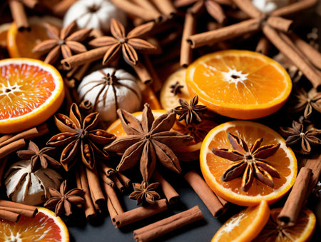 Star anise, cinnamon sticks and dried orange slices on wooden background