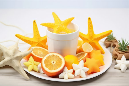 Tropical Delights: A Vibrant Fruit Platter and Refreshing Lemonade with Exotic Mango, Passion Fruits, and Beachy Decor