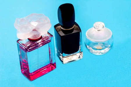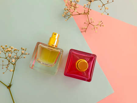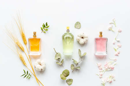 Perfume bottles flat lay. Perfumery cosmetics fragrance set