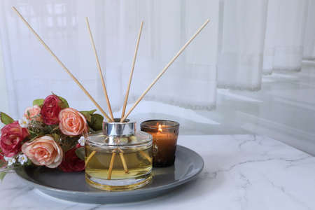 luxury aromatic scented reed diffuser glass bottle display on the white mable table in the white bedroom near the curtain to create romantic and relax ambient on valentine day
