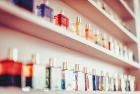 Perfume bottle collection on white background with copy space. Spray perfume bottles with blank space for text, close-up