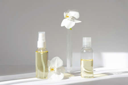 Mock-up of two glass bottles with spray gun and test tube with orchid flowers on white background in morning rays of light. Concept of skin care, spa treatments, aromatherapy
