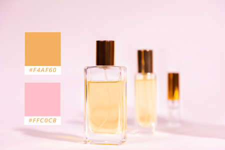 Three transparent glass perfume bottles on a pastel pink background. Samples of colors F4AF60 and FFC0CB.