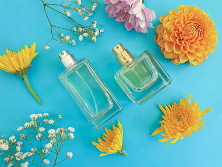 Floral fragrance - perfume bottles with flowers, top view