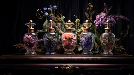 Vintage glass jars with flowers and herbs in dark Victorian herbal apothecary aesthetic AI generated