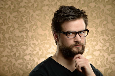 A portrait of a bearded nerd with a disheveled hairdo, gazing thoughtfully through his large glasses, scratching his chin.