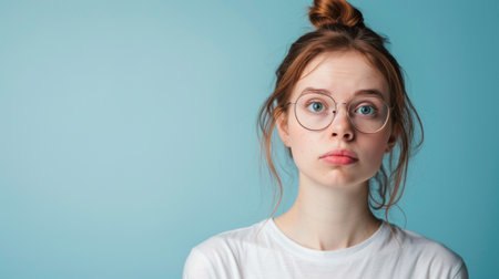 Young woman with glasses, looking slightly puzzled, on a blue background. The simple composition and soft colors highlight her thoughtful expression and casual style.
