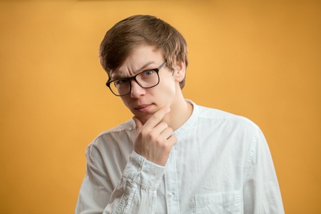Young handsome man with a questioning face studio portrait. Boy style, trendy grey shirt look with cool hairstyle isolated on white background.