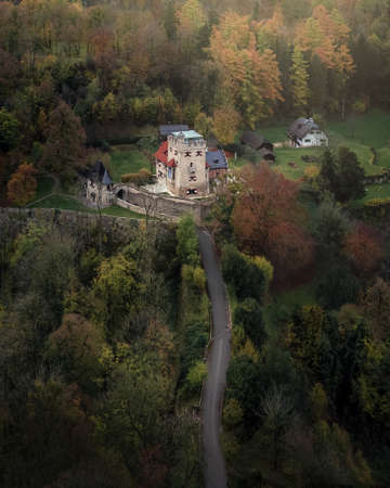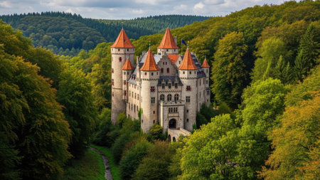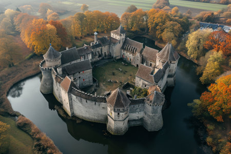 An aerial shot capturing a majestic castle perched on a hilltop surrounded by vibrant autumn foliage, the picturesque scene evokes a sense of wonder and timelessness.
