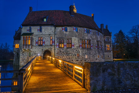 Historical castle and bridge in Luedinghausen at night