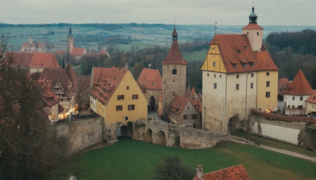 A panoramic view of a historic German town featuring a sea of red-tiled roofs, ancient towers, and a protective fortified wall.