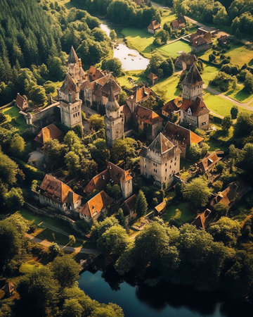 Aerial View of a Castle Surrounded by Trees, A medieval castle surrounded by moat from an aerial perspective, AI Generated