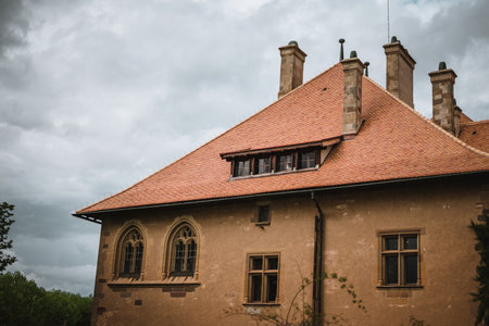 A majestic ancient architectural castle in gloomy weather during autumn, a castle with a high and sharp dome.