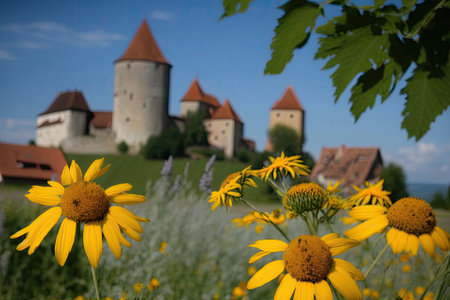 Wildflowers fill the foreground as they frame a scene of the medieval town of Avenches. Generative AI