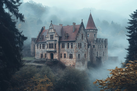 An eerie castle stands surrounded by fog and trees, evoking a sense of mystery in the early morning hours.