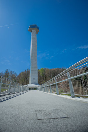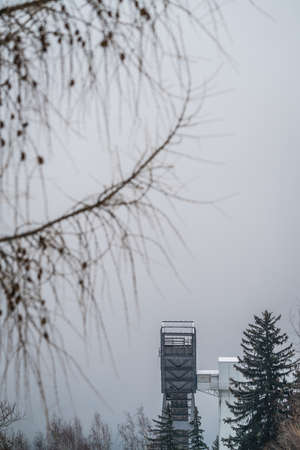 Sunny photo of abandoned ski jump tower in Mostec, Ljubljana. Relic of an old ski jumping hill in the Slovenian city. Frog view from outside.